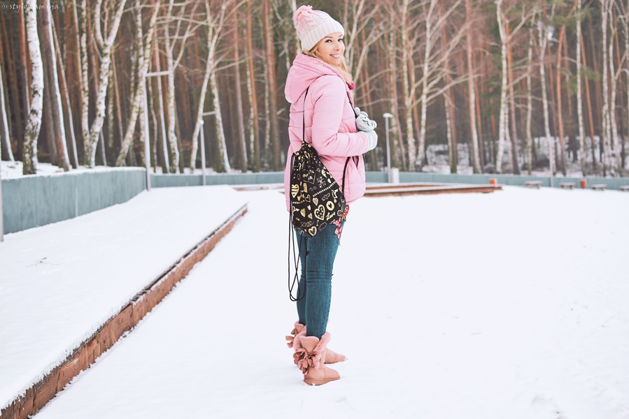 Jak widać na moim przykładzie, zimowa stylizacja potrafi sprawić wiele radości. Róż w postaci kurtki, cudownej narciarskiej czapki ombre, różowych emu z kokardkami i futerkiem. Niby go wiele, ale dzięki temu, że wszystko ma lekko pudrowy odcień, całość nie bije po oczach.